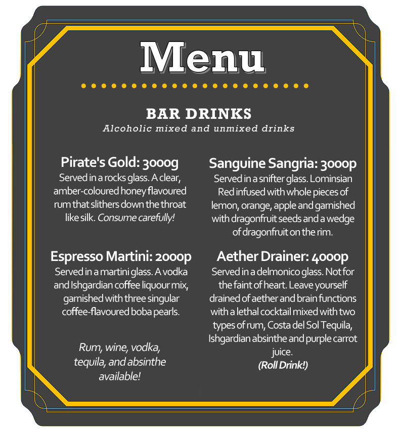 - Quest items marked with Required are items that are used towards the venue's menu items in the hopes of helping us increase the profit margin so we can be able to OOCly provide pay for all staff in the near future and hopefully, be able to pay OOC for quests.. If this is something you are not comfortable with, the quests not marked with Required will only have you trade with the Quest Giver to confirm you have acquired said items but the Quest Giver will not accept them)